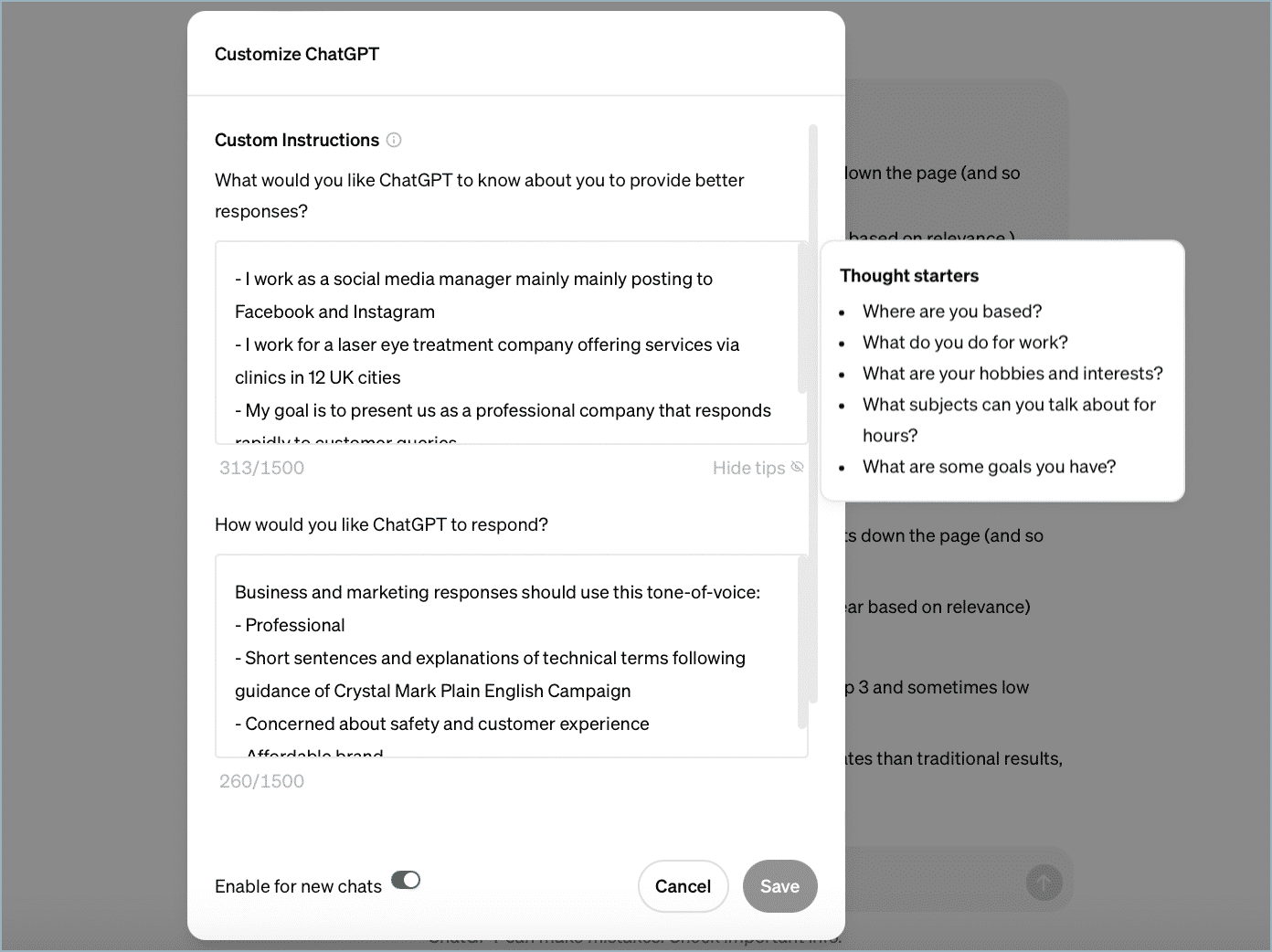 Whether you work in a marketing team of one, or a larger organization, you should agree your role and what you're aiming to achieve in your communications using ChatGPT's Custom Instructions as shown below. Not using this feature is the biggest 'beginners mistake' i see with using ChatGPT for marketing.
