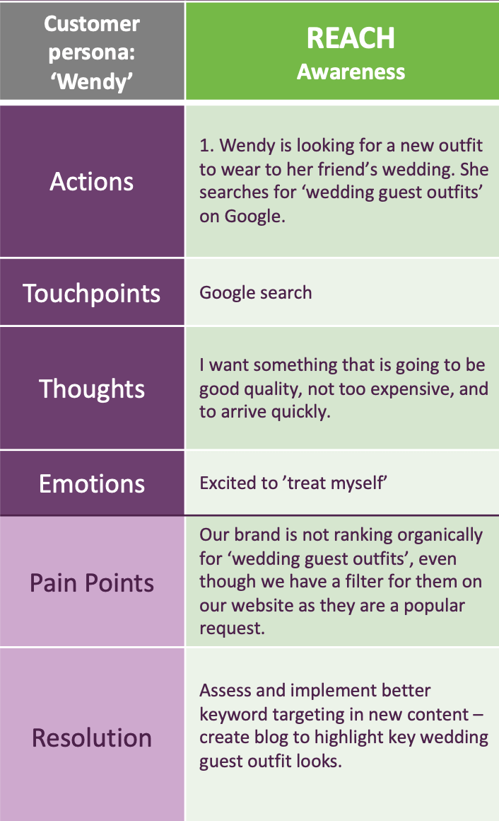 Underneath the Pain Points box we have a Resolution box, so you can easily consider how to solve this problem to improve the customer journey for Wendy (and your brand!) For this problem, our example company could assess and implement better keyword targeting in new content/blog articles to highlight key wedding guest outfit terms to improve ranking over-time. Long-term, this will help boost the brand's position and visibility in Google for key search terms that their persona uses.