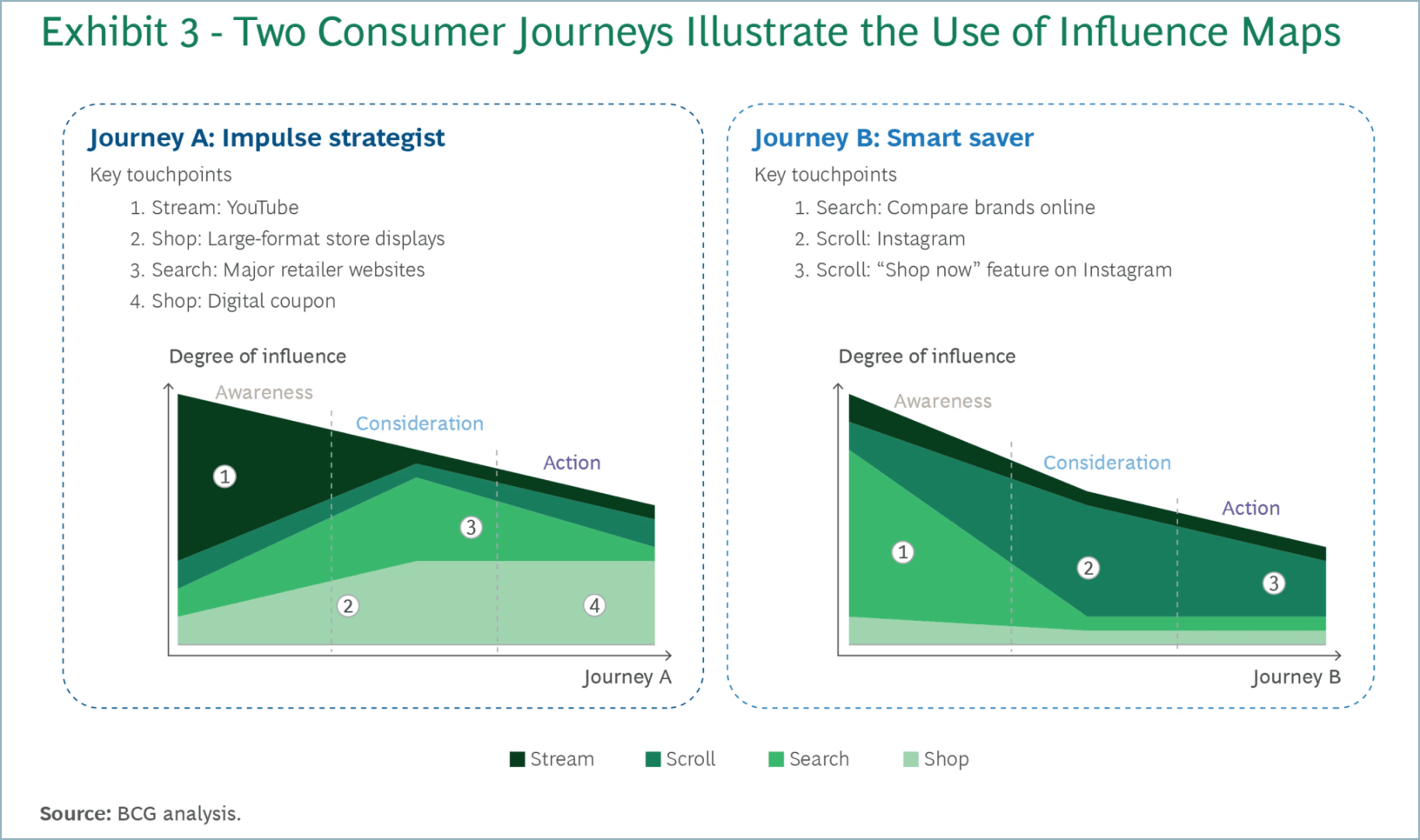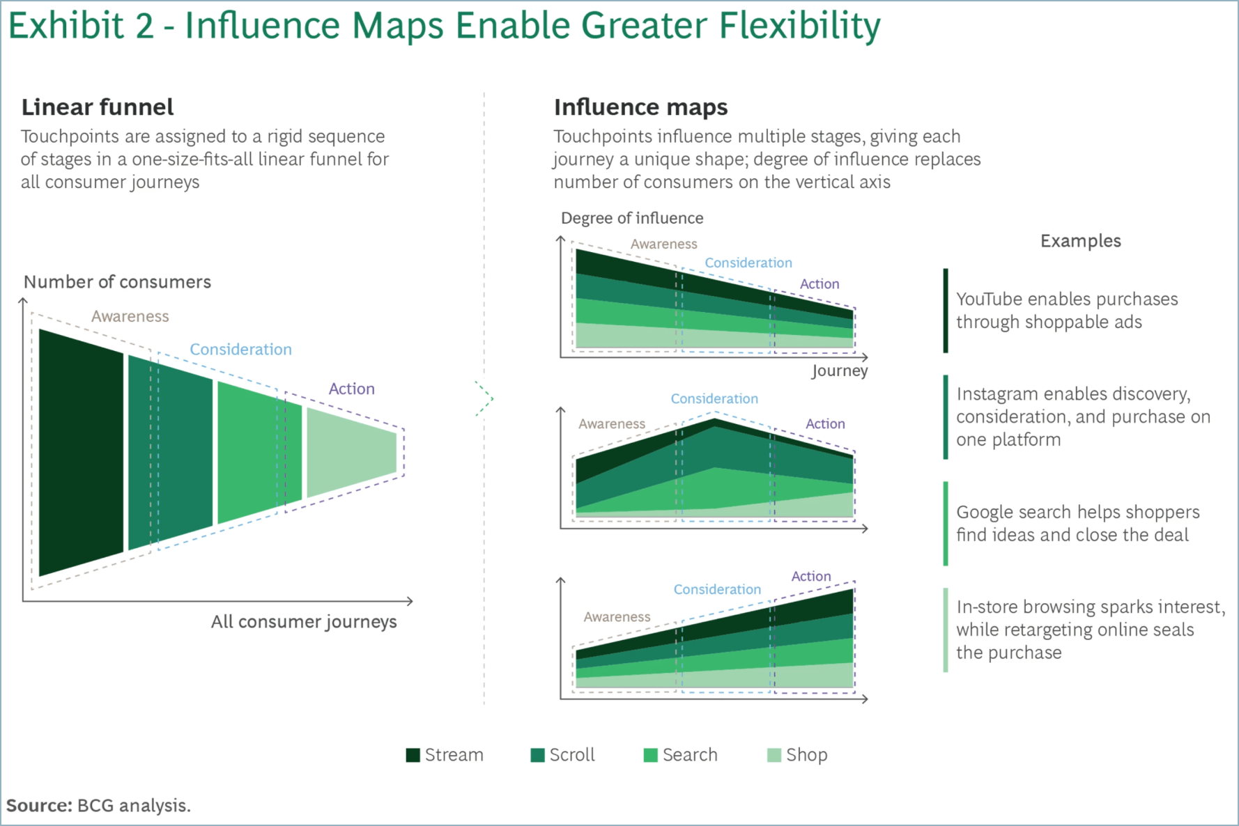 As an alternative, they suggest that influence maps can be used which show how different consumer behaviours, that they label 'Stream', 'Scroll', 'Search' and 'Shop', occur in parallel.